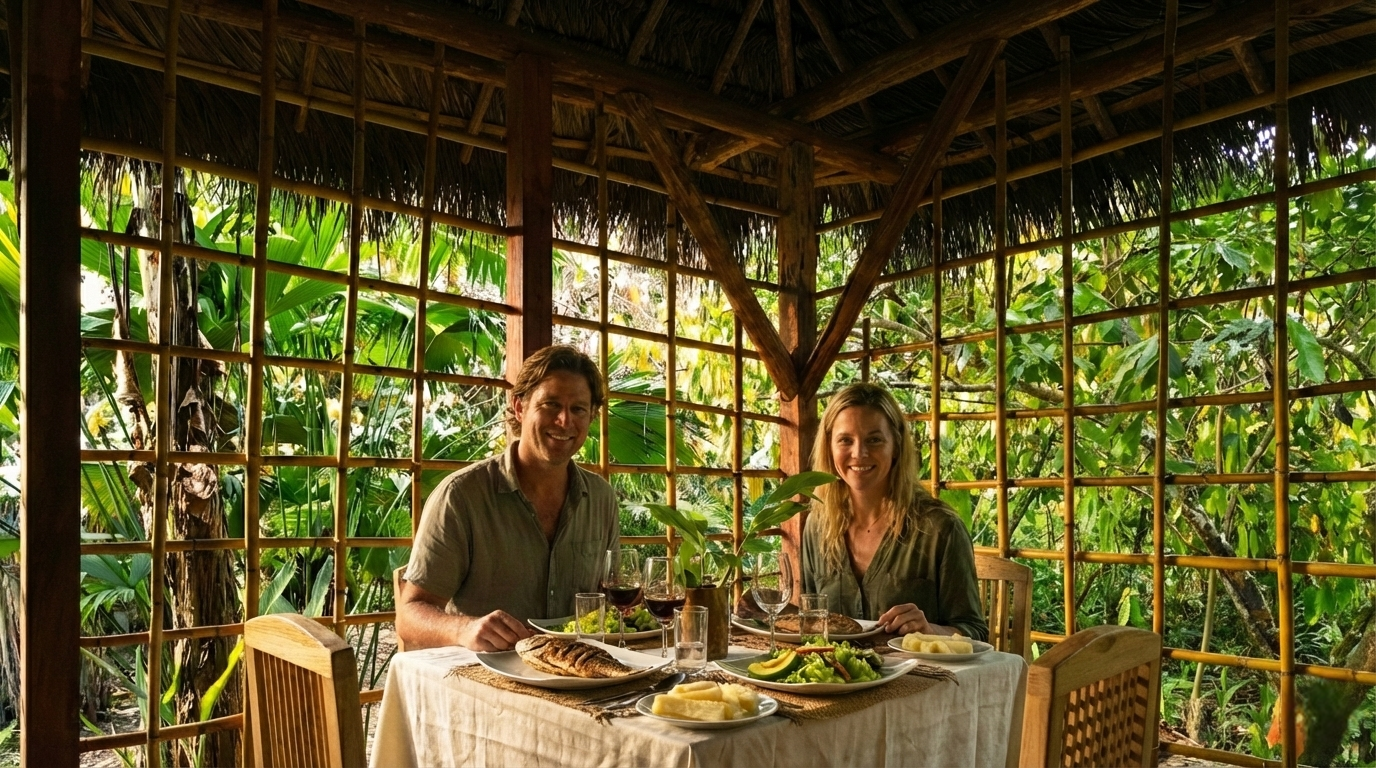 Couple having lunch at Arajuno Glamping
